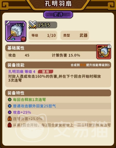 孔明羽扇:它自带15.0%的计策伤害加成,对敌人造成攻击160%的伤害之余,还能在下一个回合开始时释放3次连弩,如同在敌人的防线上撕开了三个缺口,其装备特性更是体现了诸葛亮般的未卜先知,每回合都能稳定地释放1次连弩,普通攻击额外回复25怒气,攻击加成25%,连弩伤害提升25.0%,从第二回合开始,每两回合便会重复释放上一回合的所有连弩,这一特性使得孔明羽扇在持久战中能够发挥出足够的优势。