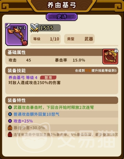 养由基弓:这件武器它自带 15.0%的暴击率,对敌人造成伤害时,能打出攻击250%的高额伤害,其武器特性更是将暴击提升到很高的数值,当武器攻击暴击时,在下回合开始时会释放出2次连弩,普通攻击额外回复10怒气,攻击加成25%,暴击伤害提升30.0%,而连弩每次命中,还会为主角增加2%暴击率、5%暴击伤害,最多可叠加10次,这一特性让使用者在战斗中越战越勇,暴击伤害不断累积。
