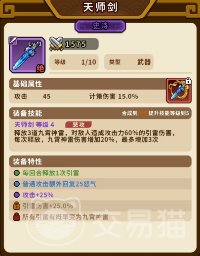 天师剑:它自带15.0%的计策伤害加成,释放技能时能召唤出3道九霄神雷,对敌人造成攻击力60%的引雷伤害,而每次释放后,九霄神雷的伤害都会增加 20%,最多可增加3次,这一特性让敌人难以抵挡,其装备特性更是神奇,每回合都能释放1次引雷,普通攻击额外回复25怒气,攻击加成25%,引雷伤害提升 25.0%,并且所有引雷都有一定概率变为九霄神雷,这一特性使得天师剑在战斗中能够持续地释放出强大的雷电之力进行输出。
