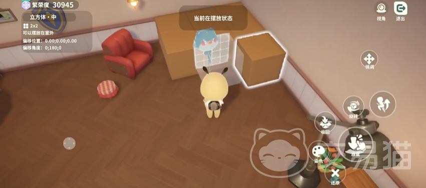 开局拥有两套房,大家在实操时,点击“摆放”,就可启动建造模式,可通过右上角的“视角”切换角色视角和上帝视角,多种视角搭配更加便利;上帝视角下,摆放还可单选,多选两种模式自由切换,家园的物品还能通过坐标轴微调,还能360°旋转,实现各种效果,升级进阶能解锁更多色盘,色彩更加丰富。