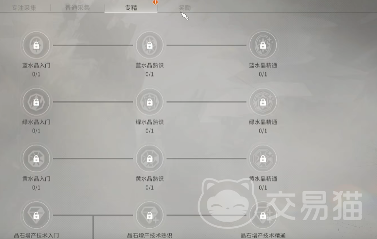 分为专注采集,普通采集,专精,奖励4个板块,其他也是同理。先看普通采集,当该职业达到了对应的等级,就可以对4种原矿石,外加6种材料进行采集,通过“追踪”的功能,就能找到对应材料在地图上所处的位置,传送到附近点位,就可进行采集,主要可获取三种奖励,一是采集材料,二是少量职业经验,可用于升级对应职业,后续能解锁更多材料,三则是有概率获得“星元尘晶”,主要用于制作金色装备。