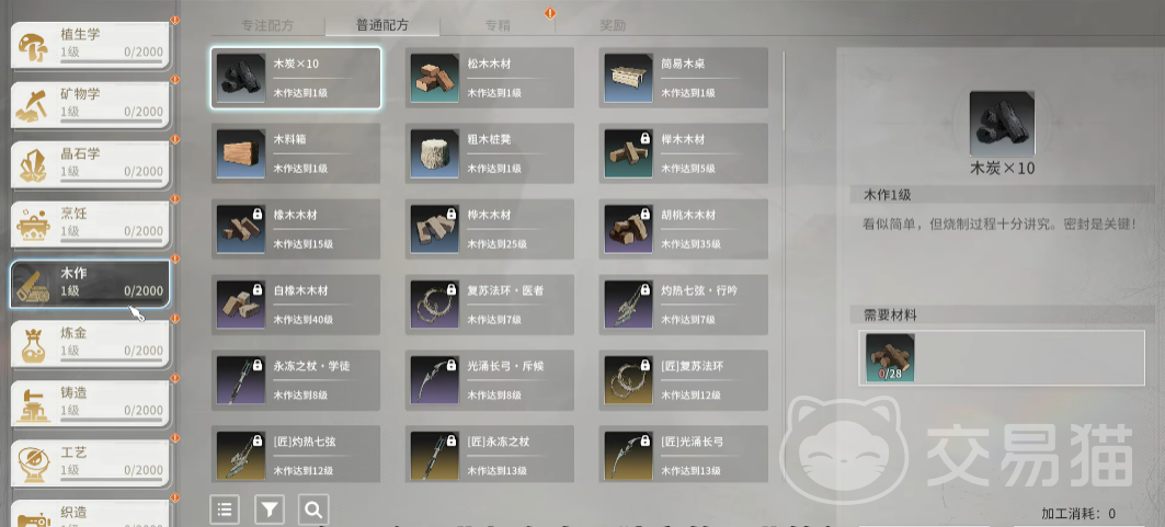 以工艺学举例,进阶也同样分为上述四个不同的模块,专精和奖励与基础的是类似的,这里重点讲一下专注配方和普通配方,专注配方主要以一些宝石的制作为主,制作这些宝石需要的原材料需要通过前面介绍的基础职业获得,也就是晶石学中的专注采集,如果玩家们并没有过多时间自己去采集,也可直接在交易中心购买其他玩家出售的原材料。