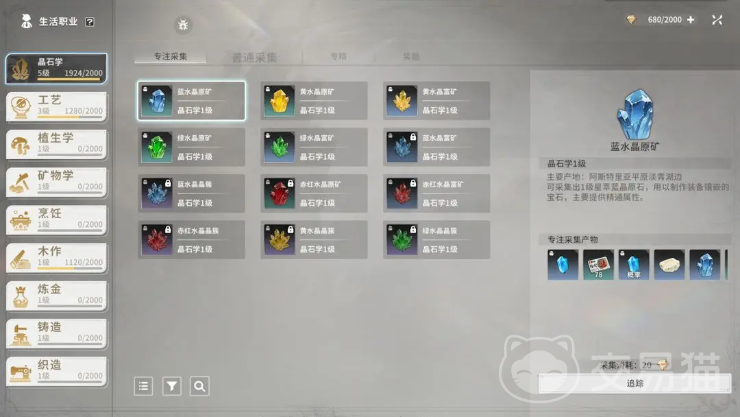 接下来看专注采集和专精,系统每天给到400专注点,最多能储存2000点,专注点的获取方式也是比较多的,比如专注恢复剂,每次采集都需要消耗20点,使用满300点就可以获得1个专精点,系统一开始会赠送3个专精点;专精点可用来解锁第三个专精板块的技能,可以用来获得新的特殊材料采集,亦或者是优化职业效果;进行专注采集时,不仅可以获得基础材料,还能获取大量职业经验,这也是升级职业等级的主要方式。其他两种基础职业和晶石学是同理的。
