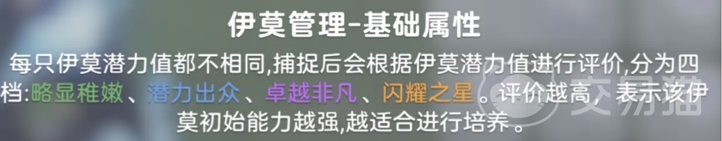 伊莫的资质决定了未来培养潜力空间,伊莫的资质分成潜力值和成长值两种,与基础属性关联。提升潜力可在商店购买潜力果实。在资质提升中,除了果实之外,还有星魂石也可以提升,这两个在伊莫养成中有着非常重要的作用,大家一定要注意积累。