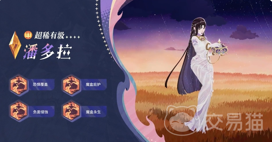 必杀技“灾厄释放”,潘多拉的魔盒中存有灾祸和希望;主动释放时,打开魔盒释放灾厄,将场上所有角色向所属阵营方向恐惧一段时间;受影响的角色将在此期间流失生命值,恐惧效果结束后,持续一段时间,这个削弱效果可叠加,但是存在有上限。