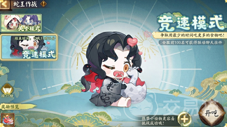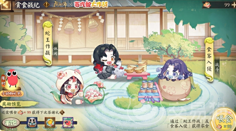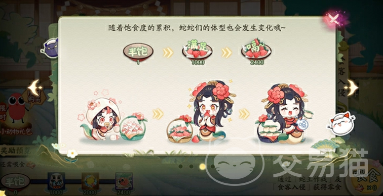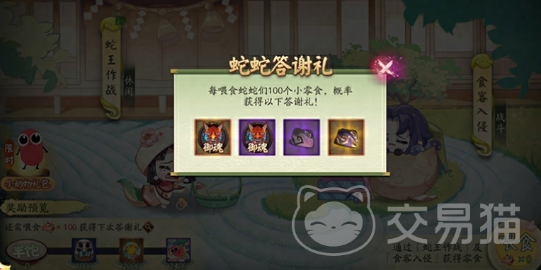 在整个活动期间,由于崽崽蛇和贪吃蛇都在四处寻找美味零食,所以大家们需要参与到“蛇王作战”、“食客入侵”活动玩法中,通过通关的方式来获取零食进行投喂,让他们吃饱,每投喂它们100个零食,就有几率获取到御魂、大蛇的逆鳞奖励,当崽崽蛇的饱食度达到1500、2000时,还能解锁限定头像框奖励。