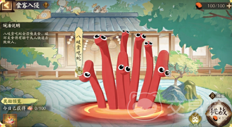 “食客入侵”需要大家对八岐贪吃蛇进行重复挑战,战斗开始时它会召唤美食并开始进食,进食后会恢复血量并得到高额减伤,大家在时间内挑战成功能获得50个零食,每日获取上限是100。