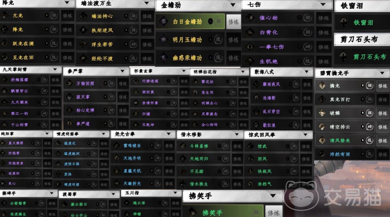 作为近战物理武学的代表,整体设计上更注重节奏把控与技能连贯。例如“降龙心诀”结合了身份系统的使用,需要玩家以行者身份在特定场景中抢夺物品并完成多次化缘,才有机会触发获取;“七伤拳”则通过支线任务“相濡以沫”完成特定条件后获得;而“断海八式”“纯阳掌”等强力拳法更融合了解密、道具搜集与剧情判断等多重机制。