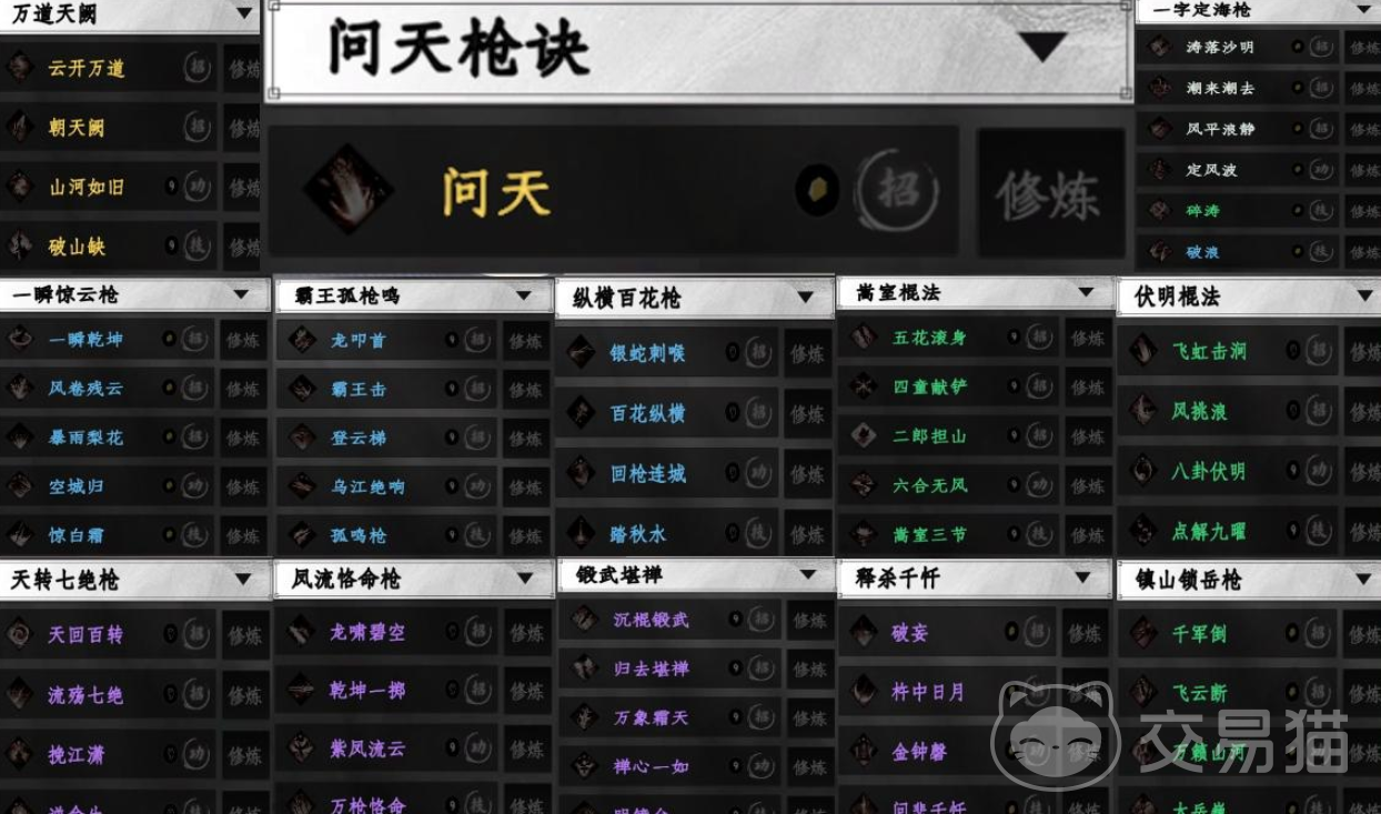 本作中偏重于范围攻击与控制能力,其中不乏高连击、远程压制的招式,比如“风流恪命枪”与“天转七绝枪”。顶级枪法“万道天阙”与“问天枪诀”分别来自不夜京兑换与主线高难任务,特别是后者涉及与义军、骆星等角色的交互选择,若剧情中处理不当将直接失去获取机会。