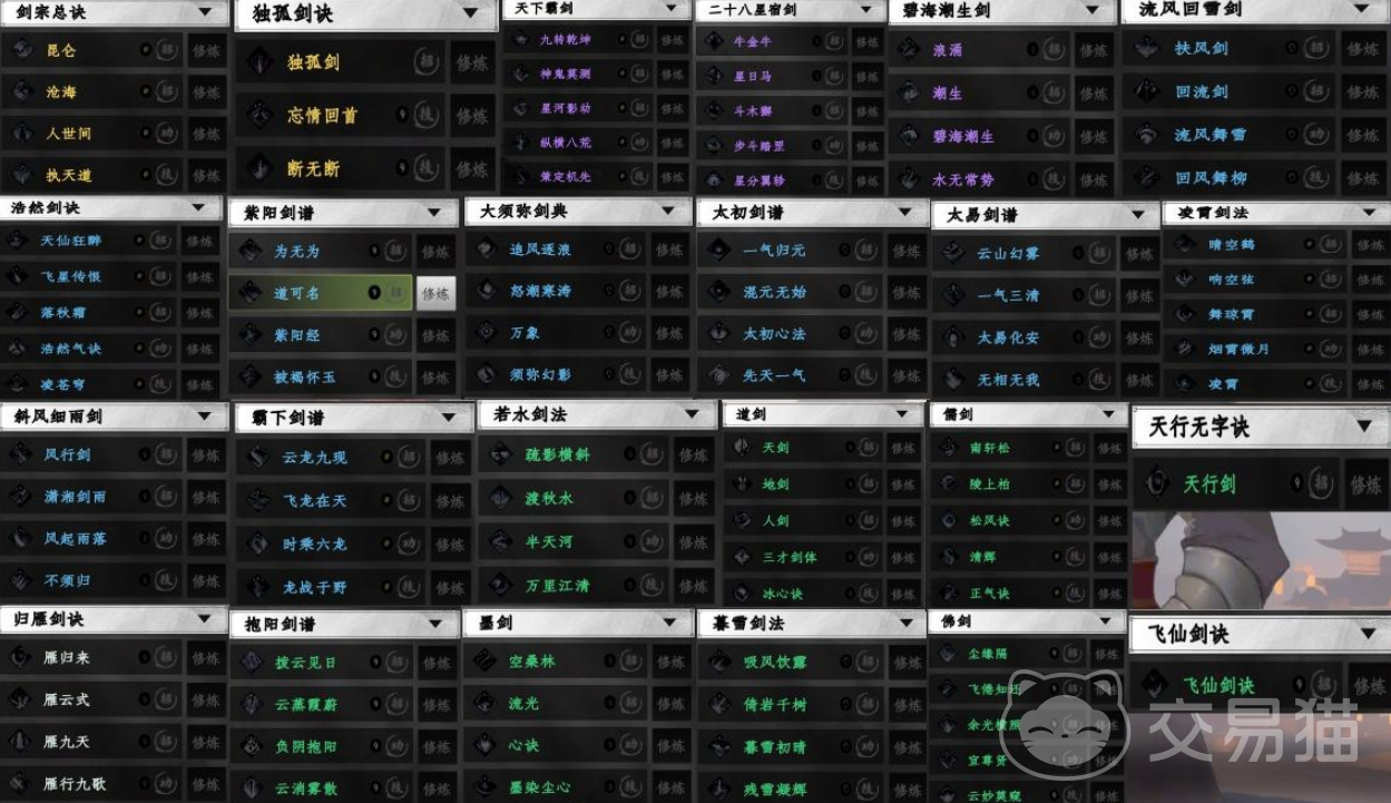 作为武学中最具代表性的流派之一,拥有数量庞大的剑谱。从基础的“绿.飞仙剑诀”、“归雁剑诀”到进阶的“蓝.凌霄剑法”、“蓝.大须弥剑典”,再到传说级的“金.独孤剑诀”、“金.剑宗总诀”,剑法谱系完整而丰富。