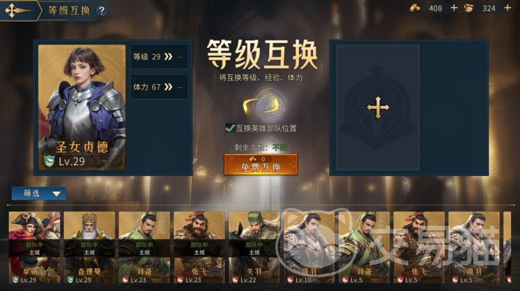 等级互换:获得新的英雄之后,可借此实现新英雄的快速升级;并不是所有英雄都能等级互换,互换后,等级经验都会置换,体力也互换,若等级高的英雄体力低,双方均衡继承体力值。如果角色在部队当中,双方还会交换位置;新手期是免费进行的,非新手时期,每周有50次的机会。