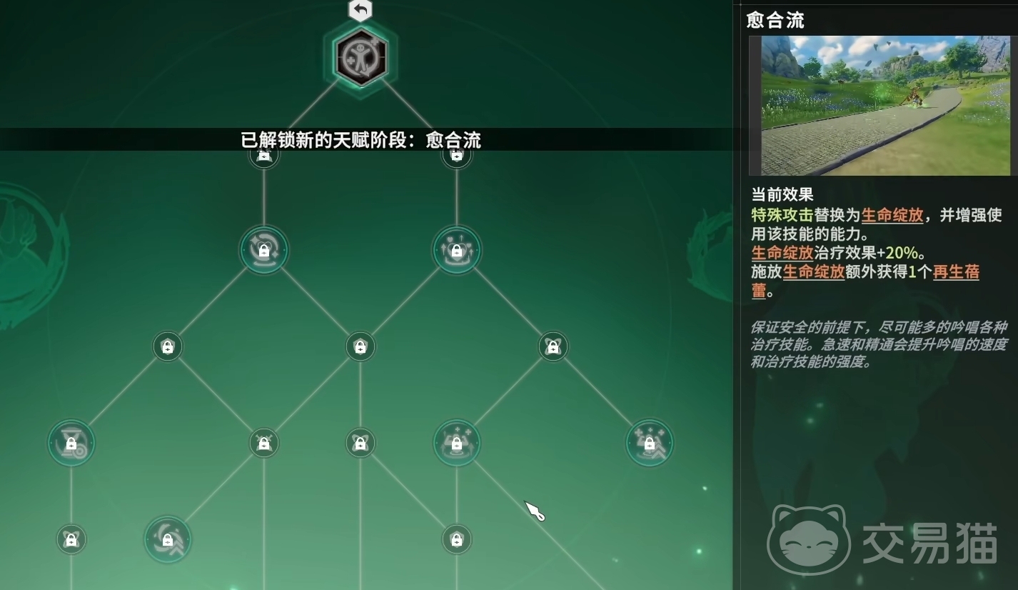 愈合流的搭配核心在于激活最下方的三个天赋核心,既三色启示、花株繁盛和极意鼓舞,在点数还不足以将这三个天赋都点亮时,优先考虑把三色启示分支上的核心都点亮,确保自己能第一时间去激活该天赋,然后再按着花株繁盛、极意鼓舞的顺序,把这两个天赋上的分支一一点亮。做到这一步后,愈合流就已经成型,能完成地承担团队所需的治疗任务。要是各位还有剩余的天赋点,也可考虑将最后一个救护天赋也点了。进一步强化对低血线目标的治疗能力。