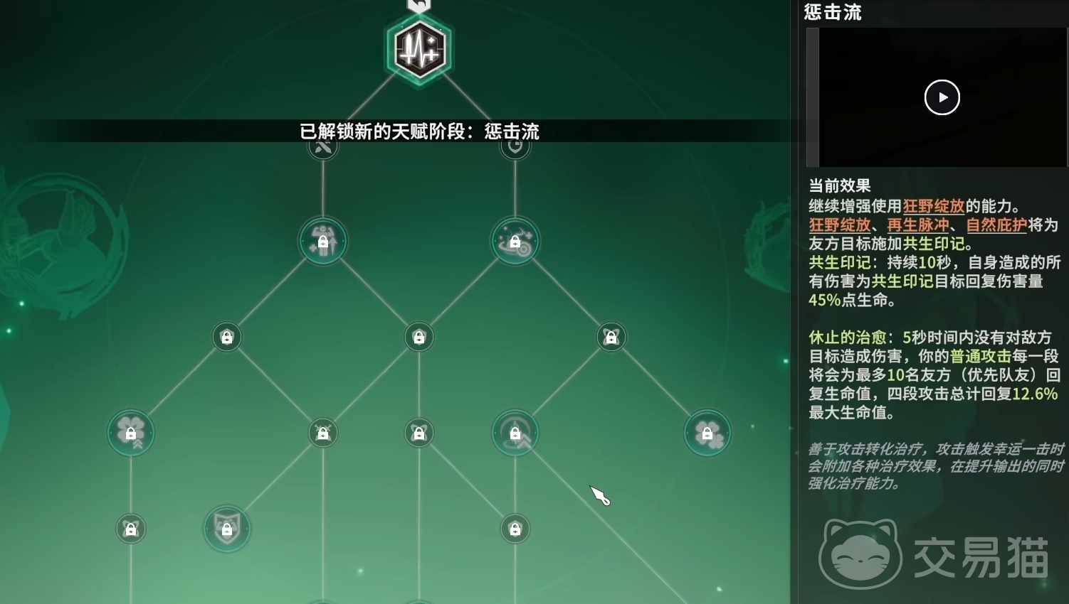 若玩家要转职成为惩击流,优先考虑将脉冲二重点出来,其次是能提升治疗能力的自然护盾,两者都点好后可先点出花语回升,来完成大招的替换。接下来,各位看按幸运伤害、脉冲回望、狂野祝福、终焉光轮、庇护的顺序,将这些天赋一一点亮,让自己伤害输出能力和治疗效果都能得到一定保障,战力提升更为平滑。最后,玩家们可优先去激动不羁之种共生和脉冲回响来提升伤害,然后把鹿之奔袭、绿意之爆发、双重灌注、共生延长、绿意护佑、繁盛点了。还有剩余的天赋点可点出复苏之翼复活队友,或是治愈脉动强化治疗能力,但要注意留出足够的点数来激活狂野庇护和狂野幸运。
