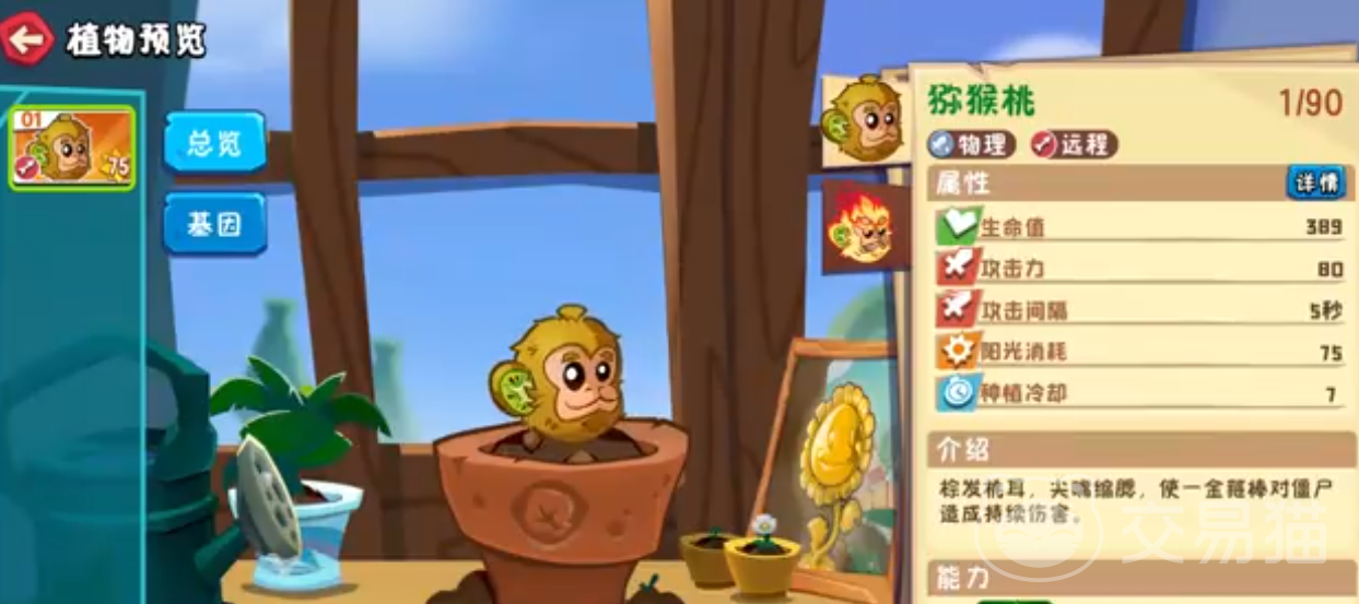 猕猴桃在橙卡中属于物理攻击、远程攻击类型的植物,猕猴桃的生命值为389点、功夫激励为80点,攻击间隔为5秒钟,每一株猕猴桃都需要消耗到75点的阳光才行,种植的话有着7秒的冷风却时间,这是一种可以使用金箍棒直接给僵尸带来持续伤害的植物。