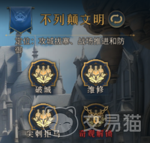 了解完这些之后,我们可以大致知道一个文明该怎么玩了。这里小编拿大不列颠举例,其文明有一个技能,就是“尖刺拒马”,其效果为“敌人在进攻之前,必须先攻击尖刺拒马”,我们可以通过释放这一“技能”,来阻截敌人的攻击,达到迟滞的效果。而大不列颠文明还有一个“特性”,工事,其效果是“所有建筑耐久+10%”,而我们的尖刺拒马正好在游戏中判断为建筑,所以血量能在原本基础上再加10%。可千万不要小瞧这两个“技能”的联动,在前期大家攻击力都没那么高的情况下,一个尖刺拒马就足以成为敌人的“叹息之墙”了,而“工事”所加的10%,更是令敌人可以对一个拒马头疼半天。当然,其它文明之间也各有技能联动,例如华夏文明的神行营与开拓,维京文明的征召与维京大营,碍于篇幅限制,小编就不在这里一一举例了。