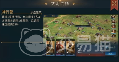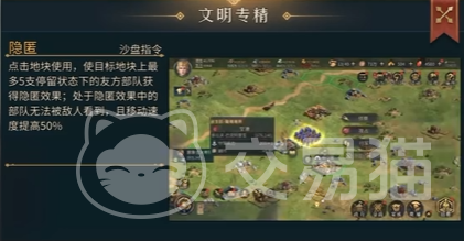 当然了,在面对前期防御能力比较强的国家,例如大不列颠文明时,一味的正面进攻肯定是要吃亏的,因此我们的“隐匿”效果就显得尤为重要了,其效果为:使目标地块上最多5支停留状态的友方部队获得隐匿效果;处于隐匿效果中的部队无法被敌人看到,且移动速度提高50%“。这一效果可以说简直无敌,光是隐匿效果就已经非常厉害了,再加上50%的移速提高,可以让我们轻轻松松的隐藏5支庞大的部队,直捣黄龙,如同闪现般出现在敌方城池周围,打对面一个措手不及。在前期看见5支部队堵在自己城池门口就够让人头大的了,更何况是”突然出现“的部队呢。