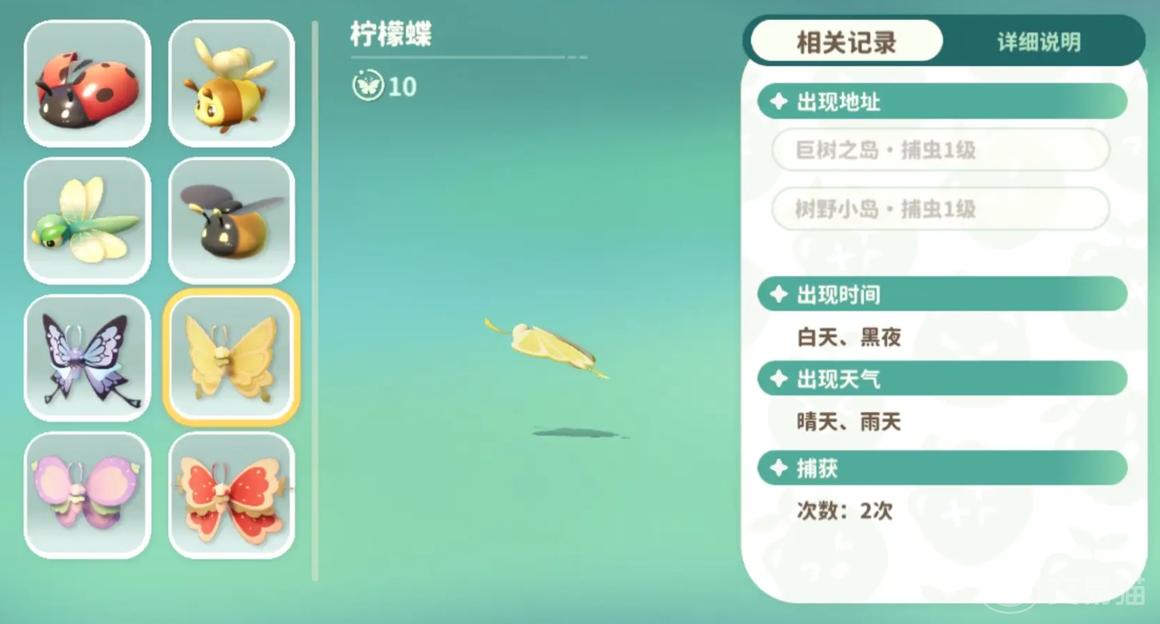 玩家需要注意,在巨树之岛跟树野小岛当中还有柠檬蝶。柠檬蝶拥有黄色的翅膀,并且带有柠檬切片的图案,特别喜欢阳光比较好的地方。另外小橘蜂分布在家园岛跟树野小岛当中,通常出现的时间是白天跟黑夜,晴天跟雨天也会出现,它拥有成黑相间的条纹,飞行的时候会发出嗡嗡的声音,特别容易被惊动。