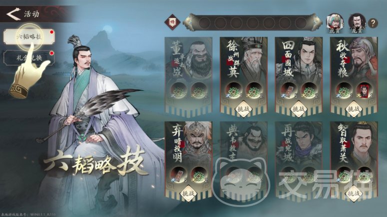 其实从大致整体玩法上来看,六韬略计和见真章,这两部分的玩法是极其相似的,不过对比难度来看,六韬略计的难度会更高,目前一共有8个关卡,每个关卡的具体难度差异各不相同,玩家在成功通关后累计4个虎,也包括龙在内,就可以获得于禁这个将领,累计获得6个龙评分就可以领取贾诩。而想要进入该游戏,可先点击右上角的活动按钮,然后就可以进入到六涛关卡,这8个关卡内容分别是董卓追击战,徐州战群英,四面围城,秋收夺梁,弃暗投明,典韦救主,再战宛城,智取萧关。