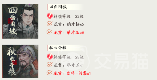 第四关是秋收夺粮,玩家需要达到28级,才能够快速解锁这一关卡,在这一关卡当中,需要注意弓箭手和骑兵的组合使用,可采用四面包围模式,快速拿下粮食。