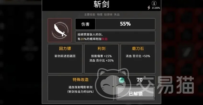 核心技能斩剑需要大家附加一百次失血效果才能达成,由于前期已经将所有非失血技能排除在外,因此每一轮战斗都只能依赖失血技能来叠加计数,通常只需正常通关几个房间便能轻松解锁该强力技能,另一个重要组件是名为芒果的特殊圣器,尽管其描述可能存在误导,但实际上它的作用是对护盾技能进行全面改造升级,实战中应优先提升护盾等级,并在挑战BOSS前的黑色商人处进行特殊强化处理。