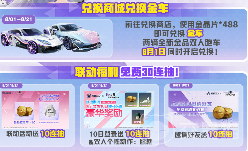 在活动期间,游戏将会开启兑换商店。玩家们只需要准备488的金晶片便可以兑换金车了。这次的兑换商店里面有着两辆全新的金品双人跑车,在8月1日的时候将会同时开启兑换。玩家们如果对新车感兴趣的话可以前去进行兑换。