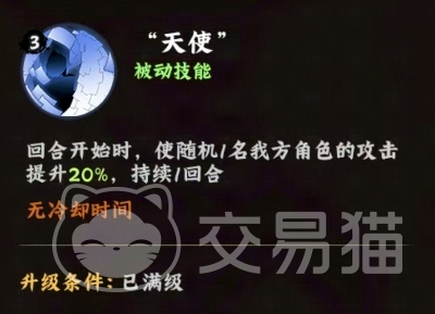 然后被动技能天使,效果是在回合开始时,使随机1名我方角色的攻击提升20%,持续1回合,无冷却时间。这个被动有着灵活增益机制,不同于固定给某个特定角色加攻的方式,天使技能采用了随机分配的方式,增加了队伍整体的不确定性和灵活性,这种设计鼓励玩家构建多样化的队伍配置,因为任何一名队员都有可能获得临时的属性提升。