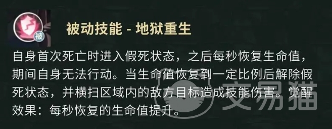 他的地狱重生技能当自身首次死亡时,他会进入到一种特殊的假死状态,在此期间每秒恢复一定的生命值,虽然无法行动,但却为后续的反击埋下了伏笔,一旦生命值回复到一定程度,他将解除假死状态,并对周围区域内的敌人发动猛烈的横扫攻击,造成可观的输出伤害,觉醒效果还能让他在假死期间每秒恢复更多的生命值,提高了他在战场上的存活能力。