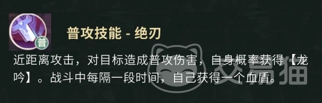 随着战斗的推进,每隔一段时间,他便会自主给自身附加一层坚固的血盾,进一步增强生存能力,当他释放怒气技煞气狂斩时,输出的同时自身再次有机会获取龙吟,而在攻击敌方单个目标时,还会触发连击效果,并且在整个技能释放过程中处于霸体状态,不受任何控制技能的影响,他的被动技能更是锦上添花,其中一个会在激烈的战斗中逐步提升自己的生命值和内力储备,进一步强化自身的战斗续航能力,并且始终保持着对其他所有阵营的克制优势。