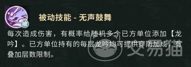 无声鼓舞这一独特技能则在他每次造成伤害时发挥作用,有几率为随机多个队友添加上珍贵的龙吟效果,此效果能够提供可观的穿防加成,他的神明金身技能则根据是否拥有血盾呈现出不同的强大效果,当自身有血盾护体时,能够提升所造成的伤害数值,同时每秒还会对周围敌人造成额外的技能伤害,而当没有血盾时,受到的伤害则会大幅降低,他的觉醒技一旦使用,他将暂时免疫所有伤害,化身为无敌的存在,并且在每次攻击主目标时都有概率追加额外的伤害。