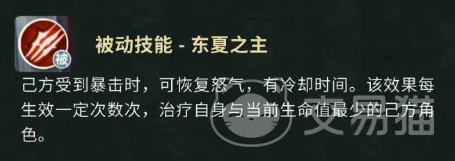 他的东夏之主技能则为团队提供了强大的支持,每当队友遭受暴击时,他能够恢复一定的怒气值,而且该效果每生效一定次数,就会治疗自身和生命值最少的队友,保障了团队的整体血量健康,他的怒气技更是将自身的生命值转化为同等数值的血盾,随后每次普通攻击的范围都会扩大,并附带额外的输出伤害。