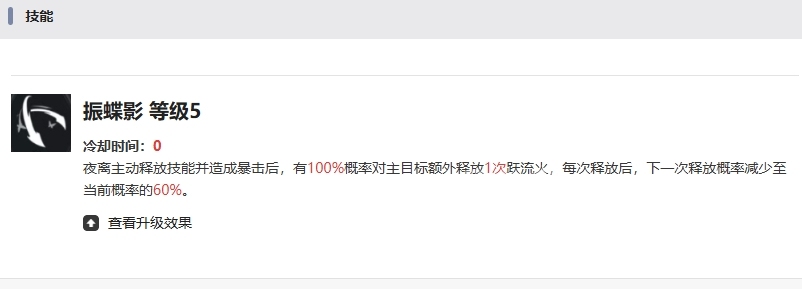 振蝶影作为夜离的被动技能,展现出独特的连击机制,每当夜离主动释放技能并打出暴击后,便会以100%的概率对主目标追加一次跃流火攻击,形成连续打击的节奏,不过每次触发该额外攻击后,下一次释放的概率会递减至当前概率的60%,此技能同样随等级成长而进化,等级2时,初始追击概率提升至80%,让连击更加频繁,等级3进一步提升至85%,增强了持续压制力,等级4达到90%,几乎确保了每次暴击后的跟进打击,等级5则将初始追击概率拉满至100%,实现了无缝衔接的爆发循环。