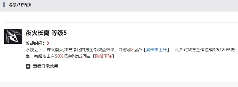 至于大招夜火长离,使用的时候大家会看到在永夜笼罩之下,特效当中的蝶火飞舞漫天,此时夜离先是净化自身所有的减益效果,同时获得持续两回合的暴击率上升状态,增幅幅度可达30%,随后,她将对敌方全体展开三段强力打击,每段攻击均能造成120%的伤害,并且每段都有50%的概率使敌人陷入两回合的防御下降状态,降幅高达60%,该技能也具备升级潜力,等级2时,伤害系数增至110%,等级3优化了净化效果,确保能清除全部减益状态。