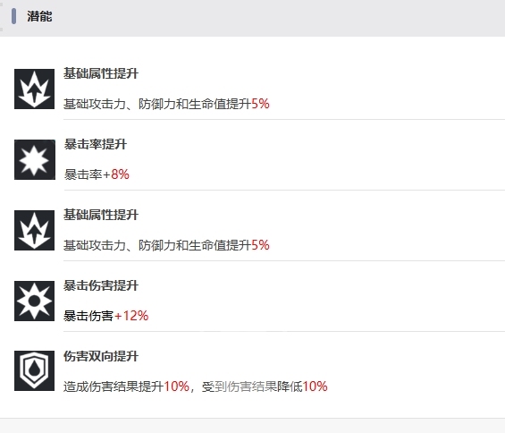 上面的特性能够最大化地发挥夜离的高暴击输出潜力,而在潜能方面,夜离同样拥有不错的成长潜力,其一为基础属性全面提升,能使基础攻击力、防御力和生命值均提高5%,全方位增强她的生存与输出能力,其二专注于暴击率的提升,直接为她增加8%的暴击率,提升她的爆发上限,再次强调的基础属性强化再次为她的各项数值带来提升,又一次将基础攻击力、防御力和生命值提升5%,暴击伤害也不甘示弱,获得12%的增幅,而伤害双向提升这一潜能则让她在战斗中不仅造成伤害结果提升10%,受到伤害结果也降低10%,达到攻守兼备的效果。