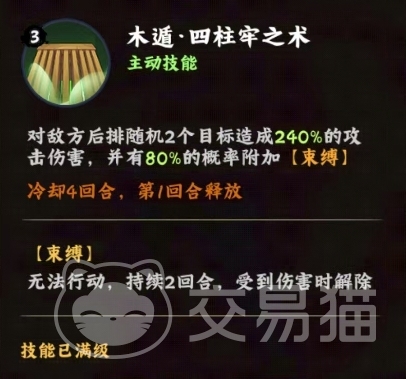 先来说说大和那令人惊艳的主动技能木遁四柱牢之术,此技能一旦施展,便会精准锁定敌方后排的随机两个目标,瞬间爆发出高达240%攻击力的强大伤害,这伤害数值本身就足够输出,且更为关键的是,它还附带了高达80%几率的束缚效果,一旦敌人不幸被束缚,在接下来的两回合内将完全无法行动,不过,当受束缚的敌人受到伤害后,这一状态便会解除。