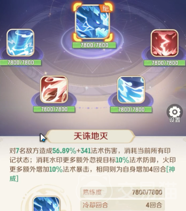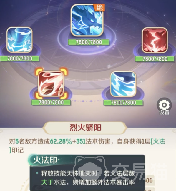 天宫的“叠泉穿心”会对单个敌人造成一定法术伤害,并且让自身获得1层名为水法的印记,他的“烈火骄阳”会对5位敌人造成法术伤害后,让自身得到1层火法,他的“九龙冰封”会对4位敌人造成一定法术伤,该技能对主目标的伤害会额外提升,并让自身得到水法1层。
