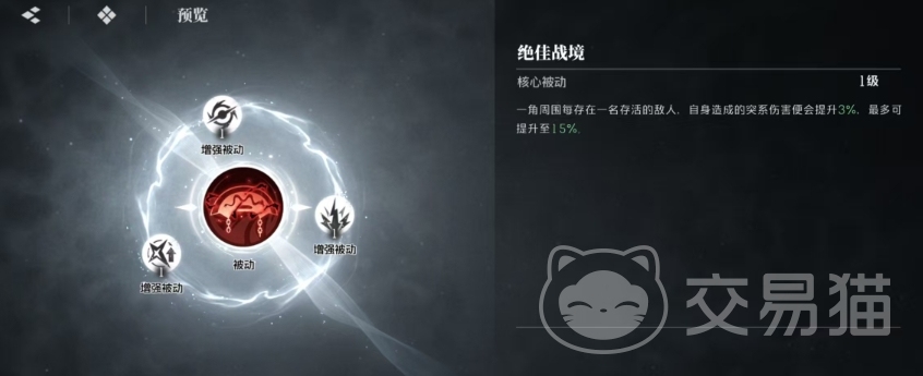 大家可以先来看斑目一角的核心被动绝佳战境,这一被动就是每当周围存在一名存活的敌人时就会触发,此时自身所造成的突袭伤害便会稳步提高3%,且最多能够提升至15%,这意味着随着战斗的推进,敌人数量逐渐减少但剩余敌人的生命值往往更为珍贵时,斑目一角的输出能力反而会不断增强,除此之外还有一些其他的增强型被动同样不容小觑,比如提升普攻分支伤害的效果,使得普攻分支在命中敌人时并非仅仅造成常规伤害,还能额外施加创痕效果。