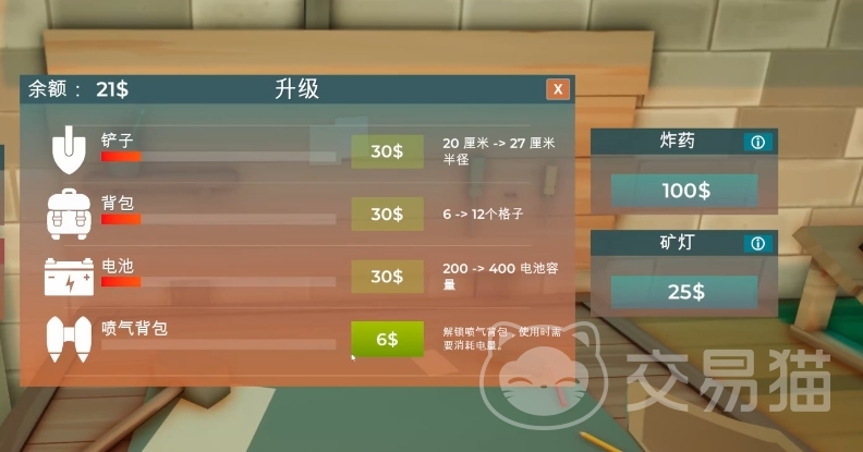 当铲子升级到特定等级后,它会变身为钻头,实现持续不断的自动挖掘功能,提高挖掘效率,与之类似的背包和电池也都支持升级操作,背包升级如前文所述可增加容量,电池升级则能够扩充电量储备,延长大家在地下的连续挖掘时间,减少因频繁充电而中断作业的情况发生,而喷气背包的出现为玩家带来了全新的移动方式,一旦购买并装备上喷气背包,玩家便可以自由地在空中翱翔,这一能力不仅方便你快速飞出复杂的矿洞结构,还能帮助大家抵达那些常规方法难以到达的特殊区域。