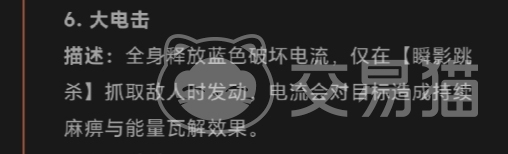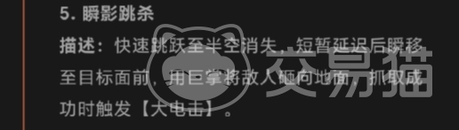 瞬影跳杀则体现了它的速度效果,它能够快速跳跃至半空,然后突然消失不见,经过短暂的延迟后,它会突然瞬移至目标面前,用巨大的手掌将敌人狠狠地砸向地面,如果在抓取过程中取得成功,就会触发大电击,使敌人陷入瘫痪状态,