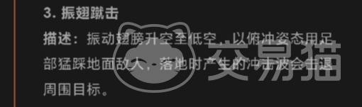 振翅蹴击同样不容小觑,欧布猛斯王振动着巨大的翅膀腾空而起,升至低空后,以俯冲的姿态迅猛地向地面的敌人扑去,用强有力的足部猛踩敌人,落地瞬间产生的冲击波如同海啸般向四周扩散,将周围的目标全部击退,即使是距离较远的敌人也能感受到那强大的冲击力。
