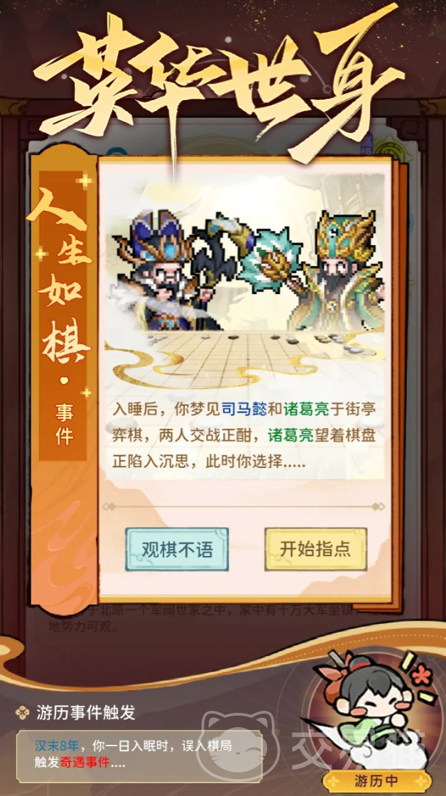 在三国这样的乱世背景之下,从小就培养好属于自己的势力是尤为重要的,因此小伙伴们在进入游戏之后将会从婴儿时期开始体验,在成长的过程中你会不断的遇到各种意外事件,即使是出门到野外随便转转,也有可能会天降惊喜,因此小编还是推荐大家尽量多开发一些地图,说不定能够让你得到巨大的收获。而在这些事件中,小伙伴们要自己来推动剧情的走向并作出选择,或许这也将会导致你获得不同的发展道路。