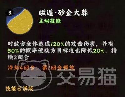 罗砂在游戏中的定位是前排减益辅助,其自身属于心类型属性,这一品级的忍者往往是玩家在操控战斗时的核心力量,故而全面了解他的技能特点至关重要,他的主动技能磁遁砂金大葬,一旦施展开来,便能对敌方全体目标造成等同于自身攻击力100%的伤害打击,不仅如此,该技能还拥有50%的几率使敌方目标的攻击力降低20%,且这一攻击降低效果能够持续两个回合之久。