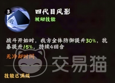 其被动技能第三只眼同样不容小觑,在每个回合开始之际,有70%的高概率对敌方随机一个角色发动效果,能够将其身上附带的一个增益状态彻底移除,并且这个技能没有冷却时间的限制,意味着在整个战斗过程中,它都有可能频繁触发,不断干扰敌方的战斗节奏与状态加持,另一个被动技能四代目风影更是为团队带来了强大的集体增益效果,当战斗打响之时,我方全体忍者的防御属性将提升30%,抗爆能力也会增加15%,而且这一效果能够持续长达4个回合。
