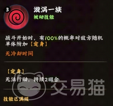 核心被动技能漩涡一族属于百分百触发的开场控制,如果说主动技能已经足够亮眼,那么她的被动技能漩涡一族则是在每场战斗一开始,就有100%的几率对敌方随机单位施加定身效果,同样持续两个回合,如此高的触发几率几乎保证了在每一场战斗中,敌方必定有一个随机角色会被牢牢锁定在原地这,一特性为玩家提供了丰富的战术选择空间,玩家可以精准地控住对方的核心输出或关键辅助角色,一旦成功限制住这些重要目标,本场战斗的胜率将会得到提升。