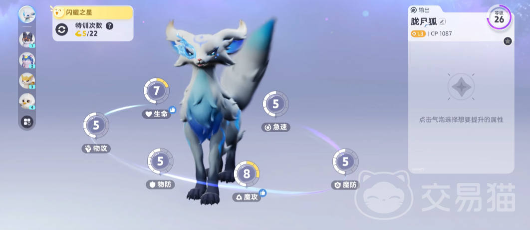 日曜狮,胧月狐是初期二选一赠送的伊莫,数值面板来看五项全满,不论是选择哪一只,对于前期的几大BOSS都是有比较好的克制作用的,很适合作为初期的主C,也就是输出角色来培养,剧情中也非常的关键,培养的优先级放在首位。