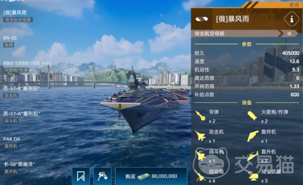 亮点在于自卫能力极强,三枚导弹、两枚火箭炮、两架直升机构成了完整的自保体系,使得她在局部防御中拥有非常突出的下限表现。但与此同时,暴风雨的机动、血量、速度在所有突航中几乎垫底,导致她的转点能力严重不足,容易被战列舰远距离狙杀。此外她几乎没有像样的防空系统,缺乏无人机与拦截机,使其面对高空导弹或持续火力时显得非常被动。所以,暴风雨更适合初入游戏的新手玩家,用于学习航母位置、控制、技能释放节奏等基本操作,在高分段比赛中很难立足。