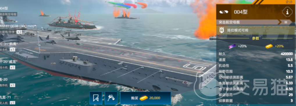 风格中庸的航母,虽然在新版本中获得了一门火箭炮,提升了自卫能力,但整体来看,她依旧没有太多突出的属性。血量、速度与机动均为中规中矩,难以在激烈的对抗中脱颖而出。曾经引以为傲的防空系统,也在新一代航母的冲击下略显平庸。不过,004保留了拦截机配置,在控制视野方面依然有一定战术价值。总体而言,她是一艘适合追求稳定发挥、不喜欢承担太大风险的玩家的过渡型航母,虽然难以打出极限操作,但也不容易掉链子,算是“万金油”代表。