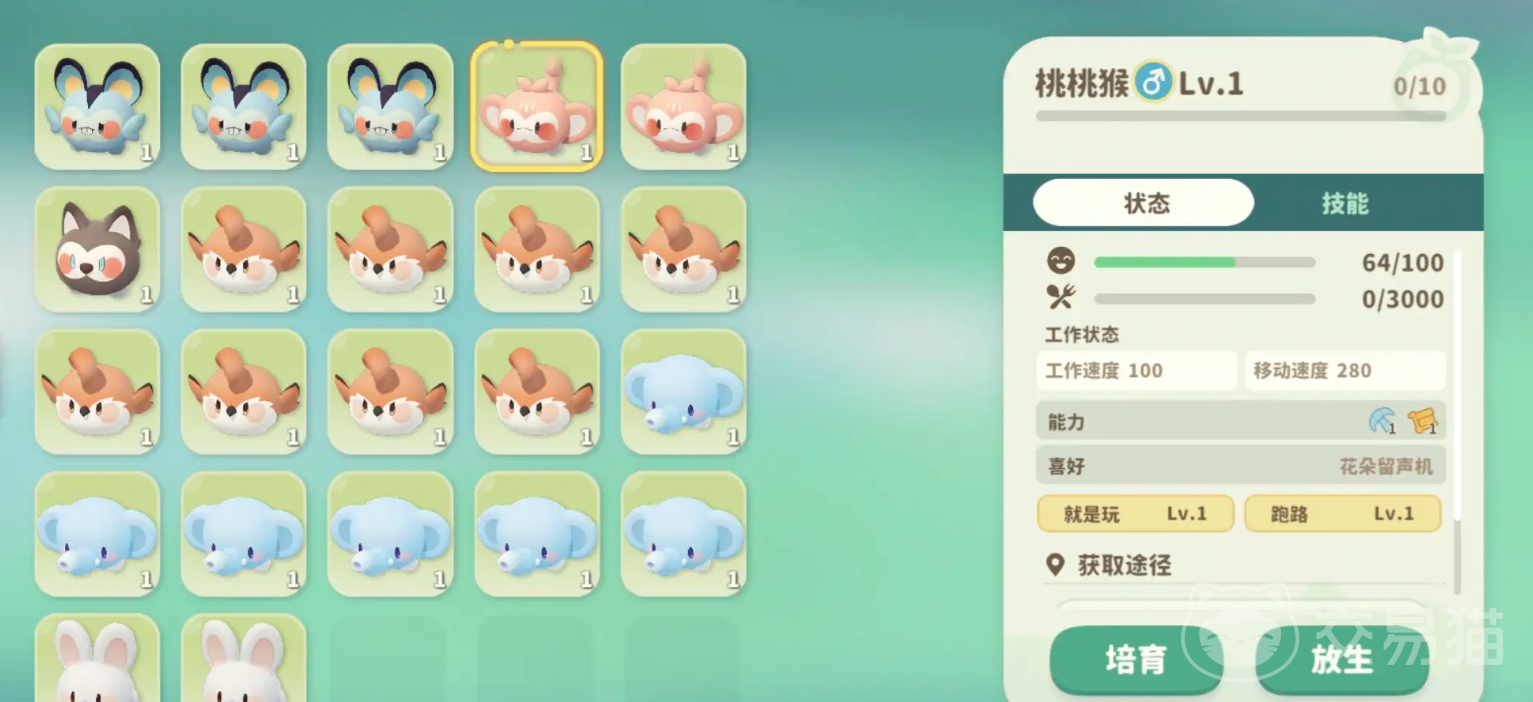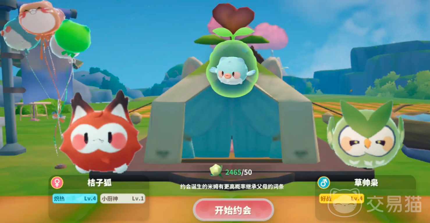 需要注意如果是约会产出的云朵蛋,将会遗传到父母的部分属性,所以我们选择的两只词条等级是越高越好,获取的云朵蛋如果是蓝色,会出水系如蓝蓝鼠、大耳象等米姆,是绿色会出植物系,如桃桃猴、草帅枭,是棕色会出土系如蓬蓬哈、门牙兔。