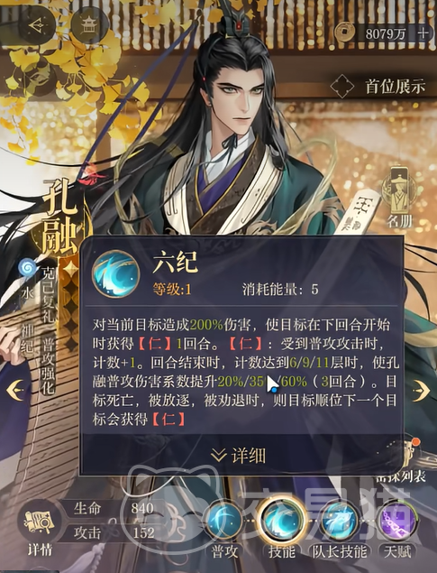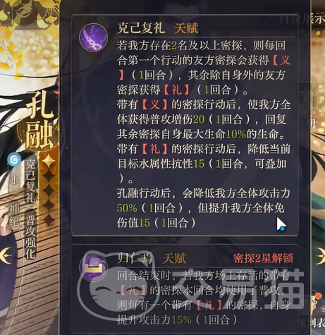 孔融的天赋技能“克己复礼”也是其强度的一大亮点。该天赋可以让队伍中的队友获得“义”和“礼”状态。拥有“义”状态的队友在行动后,会对全队进行普攻增伤,并恢复生命;而拥有“礼”状态的队友,则可以降低敌方目标的水属性抗性并叠加。这个天赋的设计非常具有战略深度,既能增强队友的输出,又能有效削弱敌人的防御,达到攻守平衡的效果。而且,这两个状态能够在战斗中持续存在,甚至可以在长时间的对抗中逐步改变战局,给予队伍更多的作战机会。