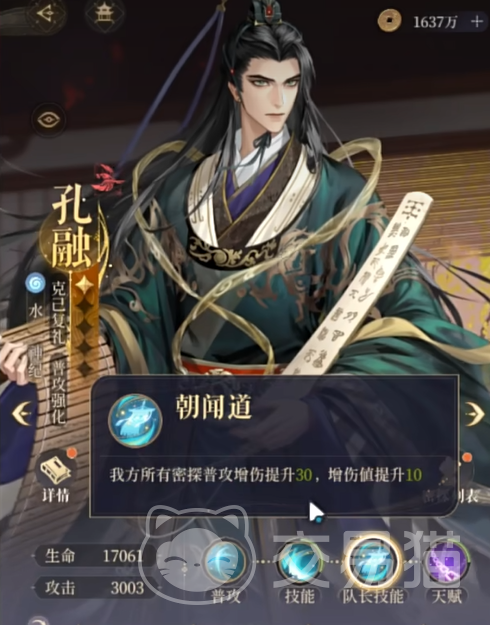 孔融的普攻技能表现得非常亮眼,能够对目标造成多次伤害,而他的队长技能“朝闻道”更是为整个队伍的普攻增伤提供了极大的提升。特别是随着密探队伍中人数的增加,孔融的增伤效果也会随之增强,这使得他在密探阵容中的核心地位得以凸显。队长技能的增益作用,能够大幅提升队伍的整体输出潜力,尤其对于以普攻为主要输出手段的阵容而言,孔融会是一个极为合适的队长。更为重要的是,孔融的队长技能不仅能够提升输出,还能增强队伍的稳定性,为队员们提供持续的增益效果,使得整体作战更加高效。
