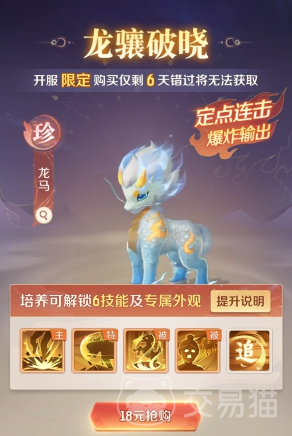 目前,龙马在灵兽大冒险中唯一的获取手段就是氪金购买,玩家们可在开服庆典的活动页面里找到龙骧破晓活动,进去后就能看龙马的购买页面,其售价为18元,买到后玩家就能拿到龙马并能对它进行培养。若玩家还想继续投入资金,可在该页面里继续购买龙马礼包,能让龙马直升到修行二阶提升自己的伤害系数,令它在初期就拥有更为强大的作战能力。要注意,龙马是开服限定的神兽,只在开服庆典活动能获取,待活动时限结束后,龙马的购买渠道也会一并关闭,往后玩家便无法再继续购买,还想收集它的话只能寄希望于回场活动。